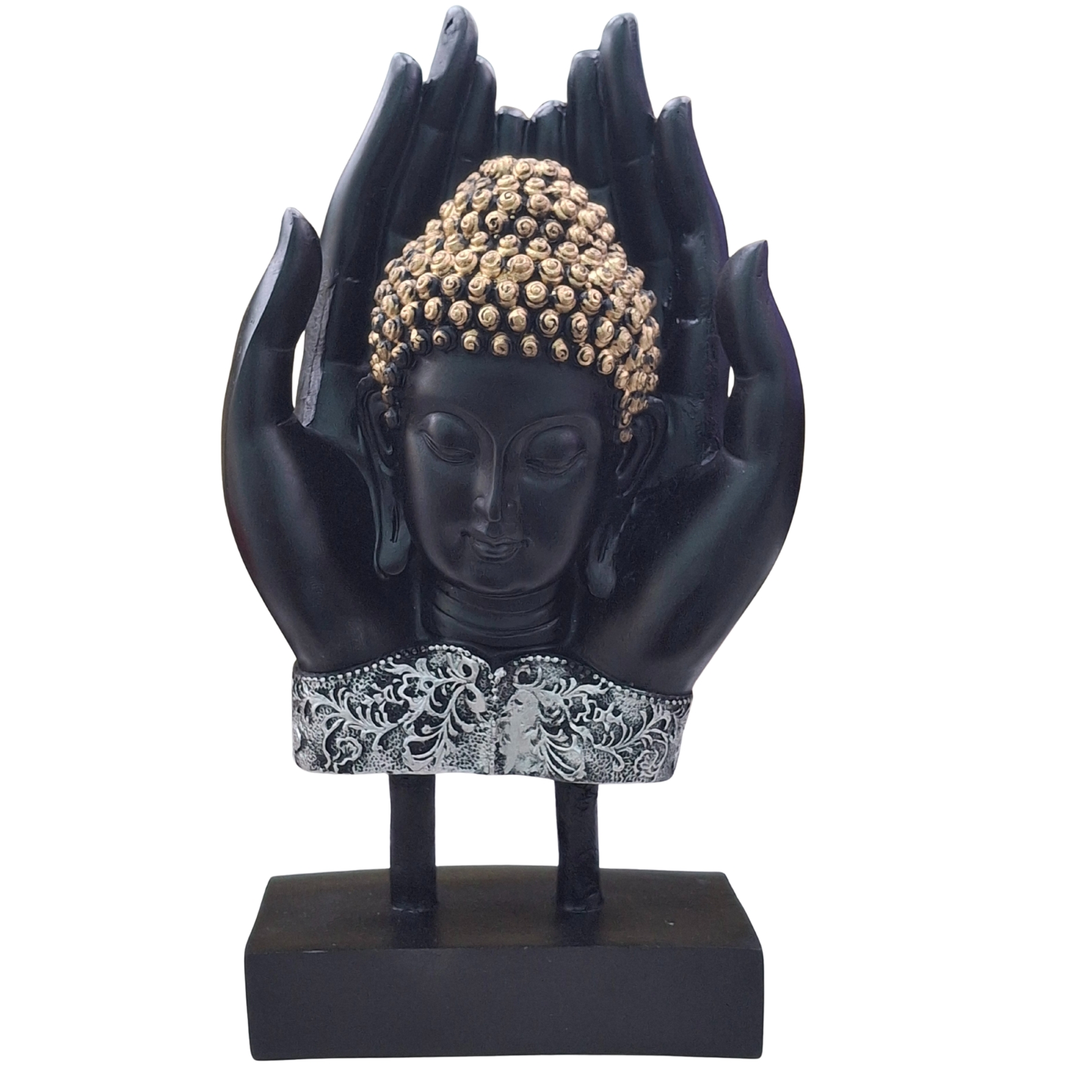 The statue portrays a peaceful Buddha head with intricately designed golden curls, embraced by a pair of large black hands. The hands give an impression of divine protection and care. The base and structure are solid black, with a detailed silver floral pattern on the chest area, enhancing the elegance.