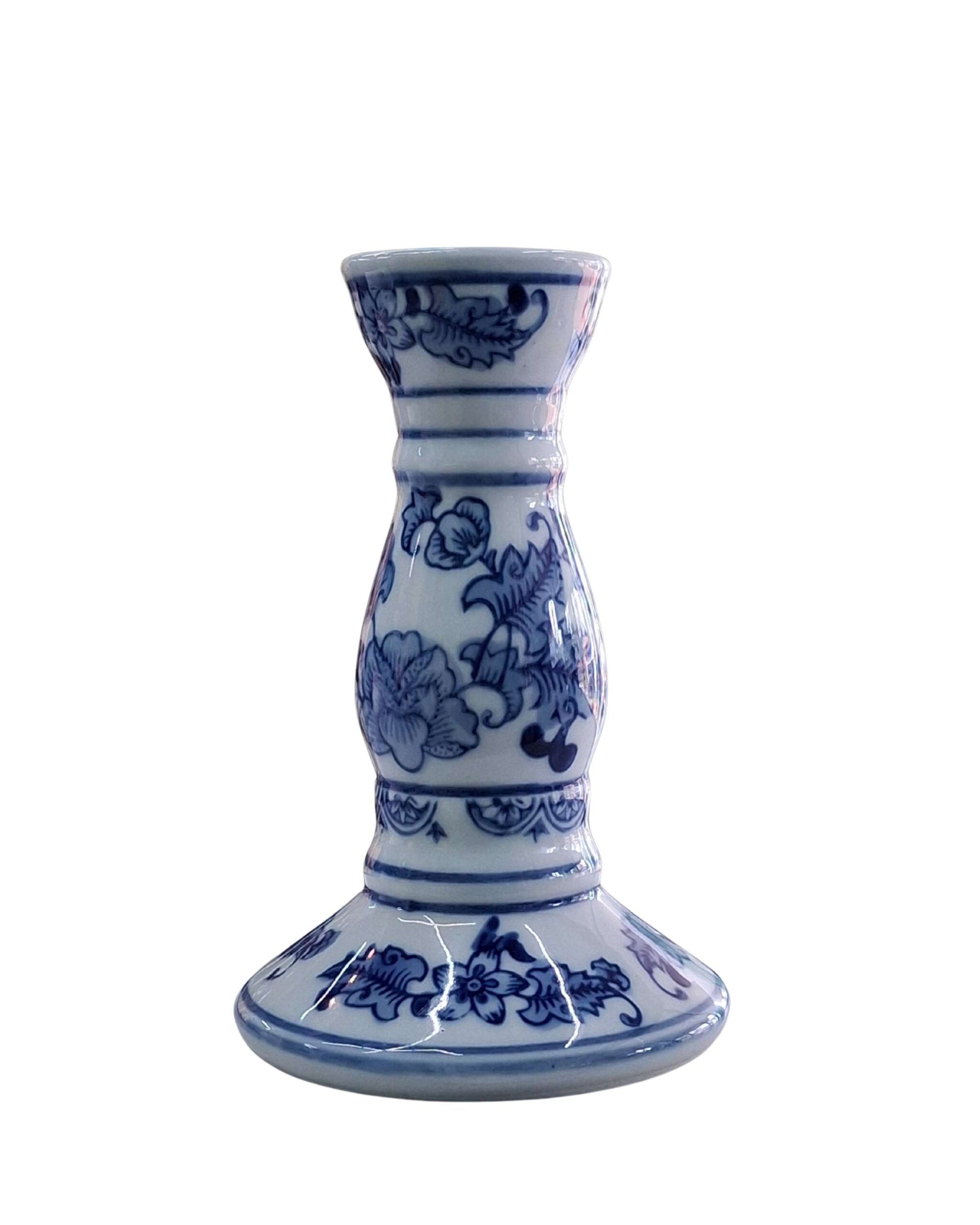 This is a traditional ceramic candle holder featuring classic blue floral motifs on a white glazed background. The design is reminiscent of oriental or Delft-style pottery, with intricate hand-painted patterns giving it an elegant and vintage appeal. The glossy finish enhances its visual charm, making it a beautiful piece for decorative or functional use in home décor.