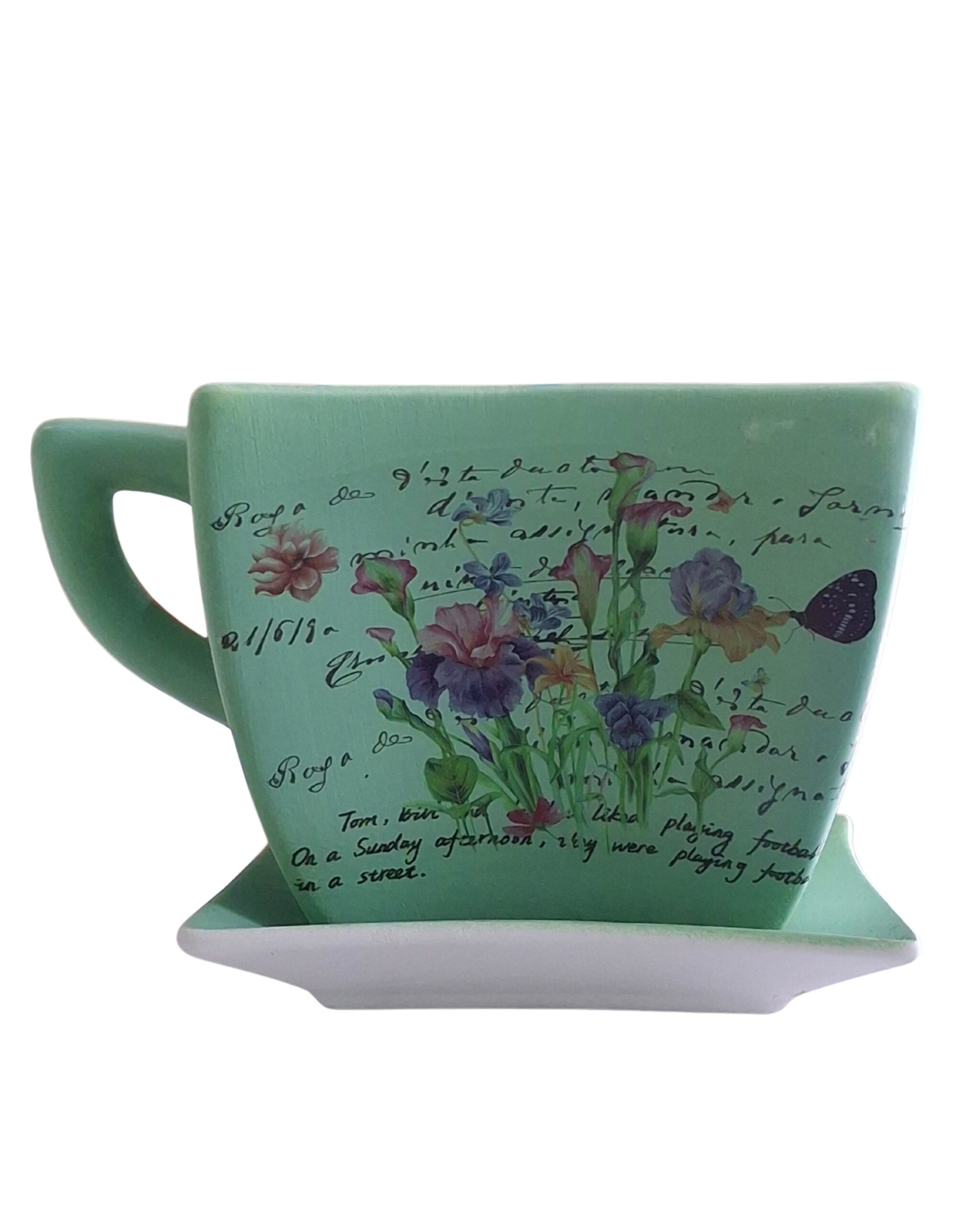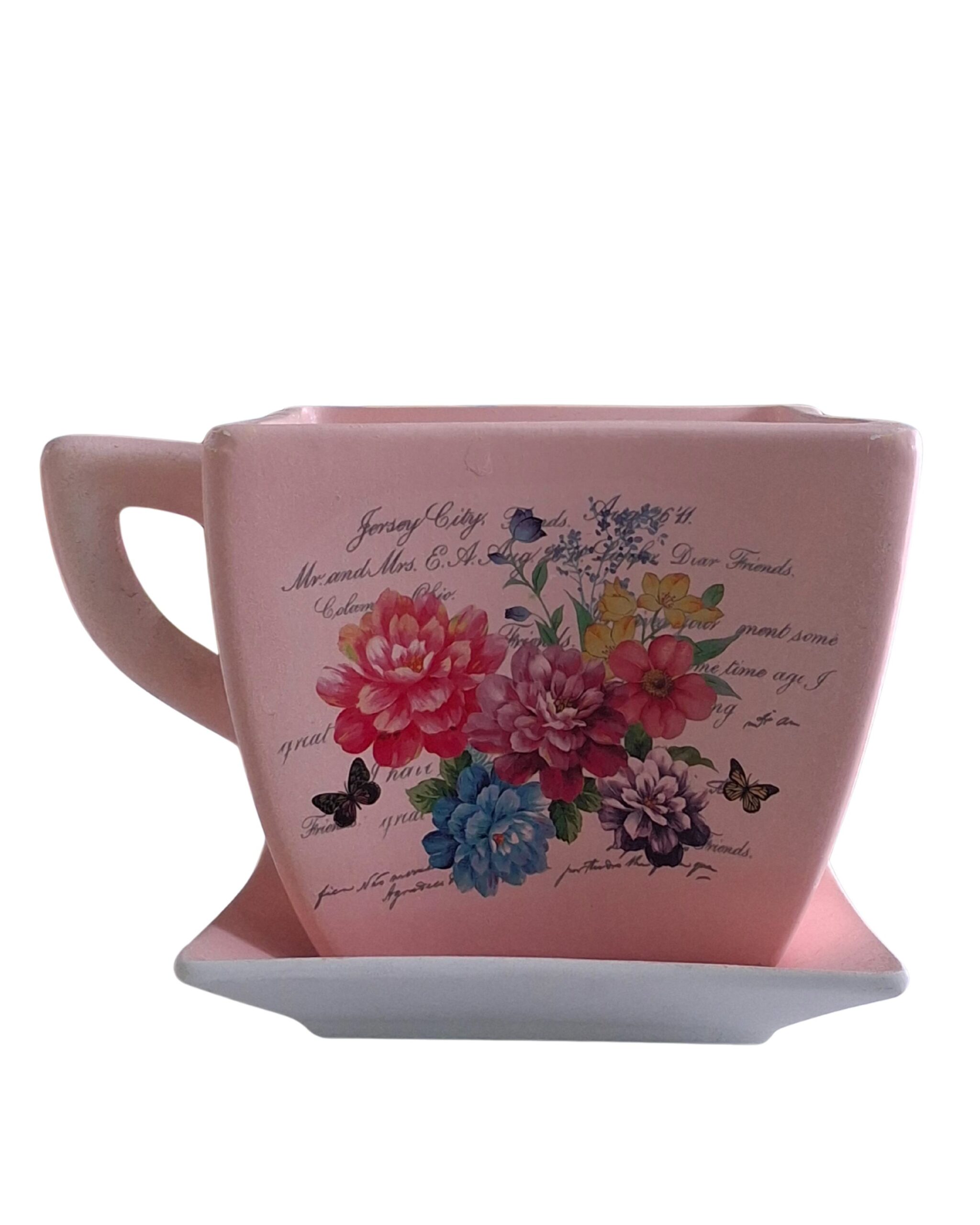 This is a decorative ceramic planter designed in the shape of an oversized teacup with an attached saucer base.The handle and wide opening make it both functional and visually appealing, perfect for displaying small plants or flowers. This piece combines whimsical charm with a classic floral aesthetic, making it ideal for home décor or gifting.