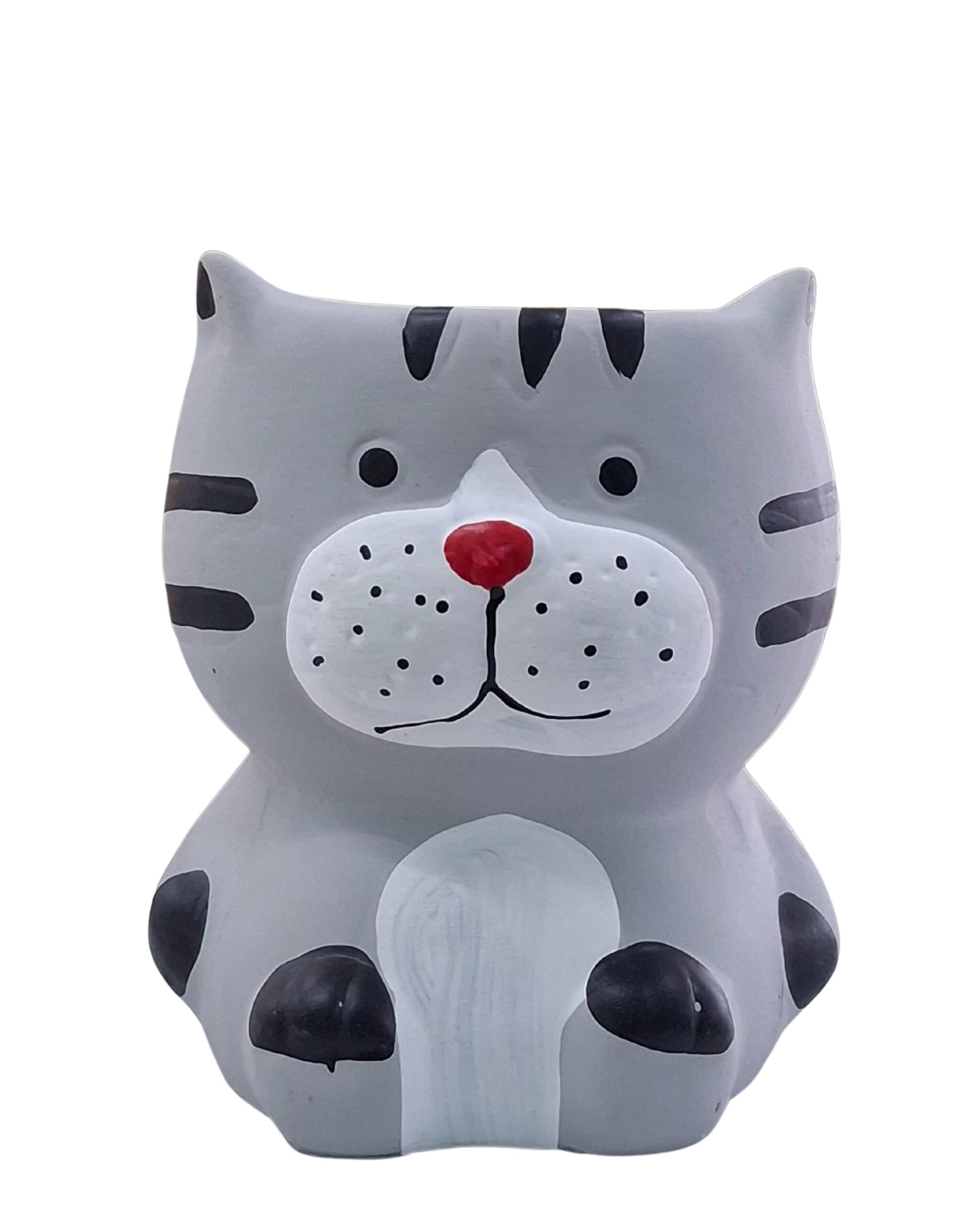 This adorable planter is designed in the shape of a sitting cartoon-style cat. Painted in light gray with black stripes and paws, it features a wide white snout with black whisker dots, and a bright red nose for a playful touch. The facial expression is friendly and whimsical, with upright ears and round eyes giving it an animated, cheerful look. Perfect for small plants or succulents, this planter adds a touch of fun and charm to desks, kids’ rooms, or any cozy corner in need of personality.