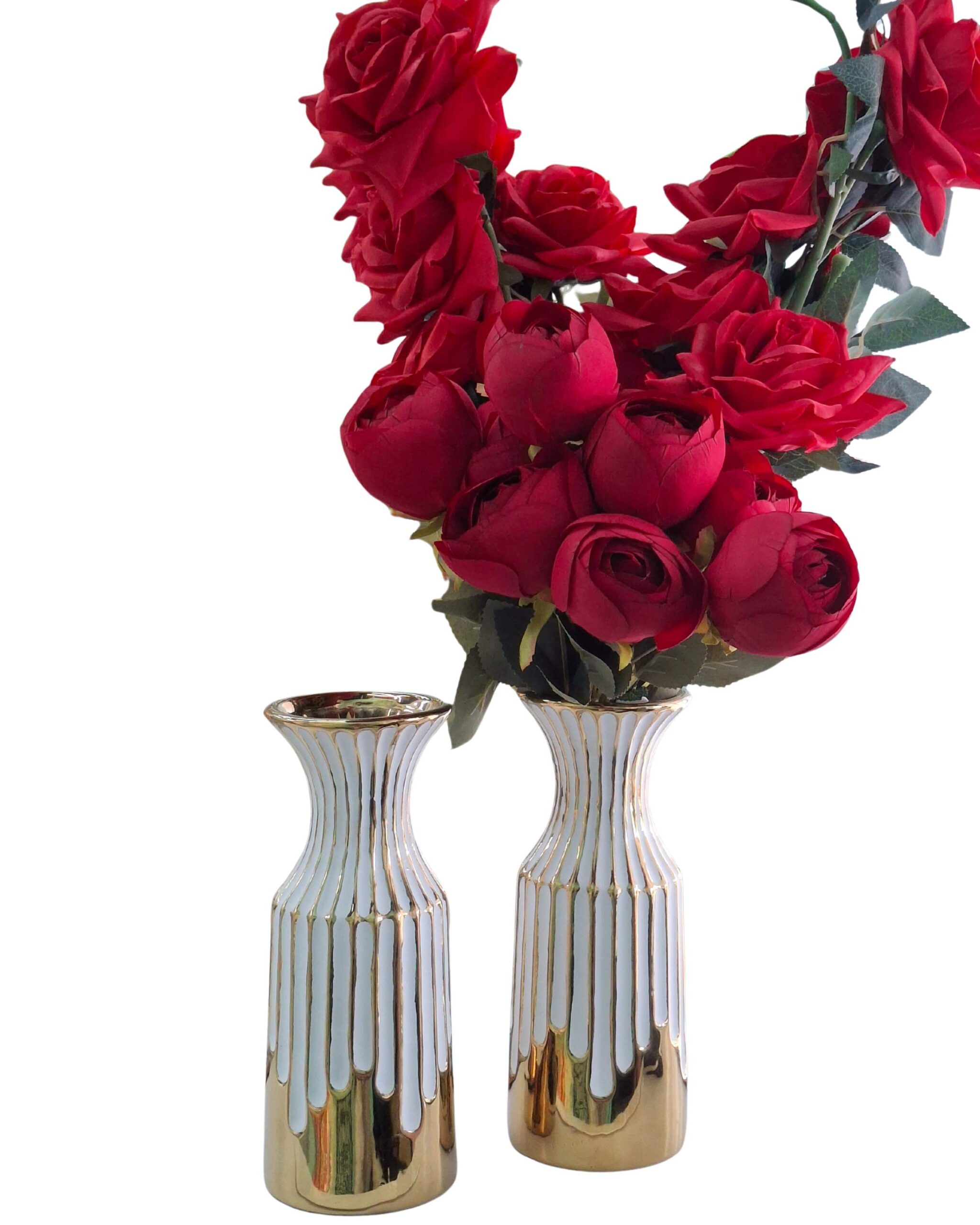The image shows two elegant ceramic vases with a narrow neck and a flared mouth. They feature a vertically ribbed design with alternating glossy white and reflective gold finishes that create a modern and luxurious look. One vase holds a bouquet of artificial red roses with green leaves, adding a vibrant contrast to the shiny surface of the vases. The combination of the metallic finish and rich floral arrangement gives the setup a refined and decorative appeal, suitable for home decor or special occasions.