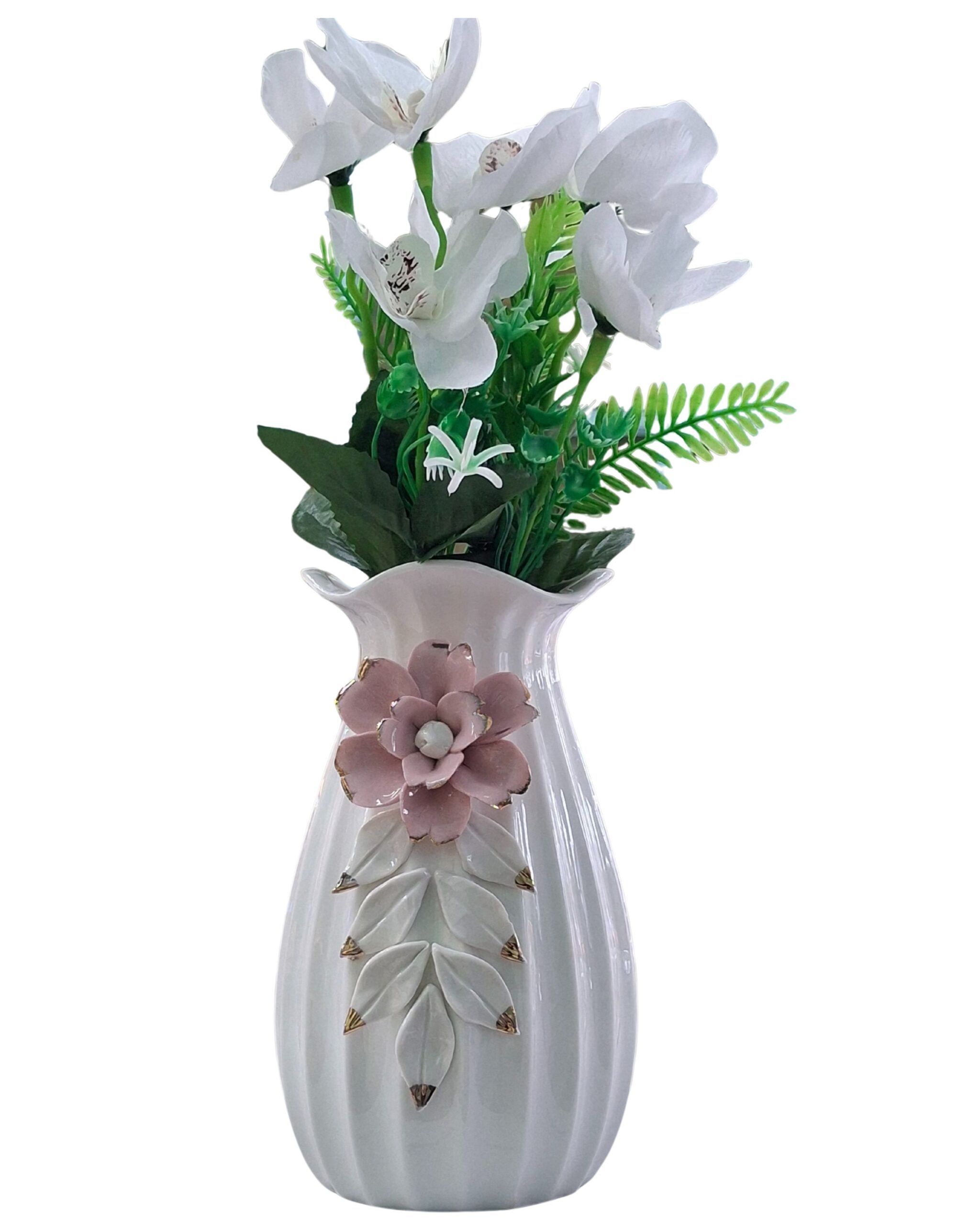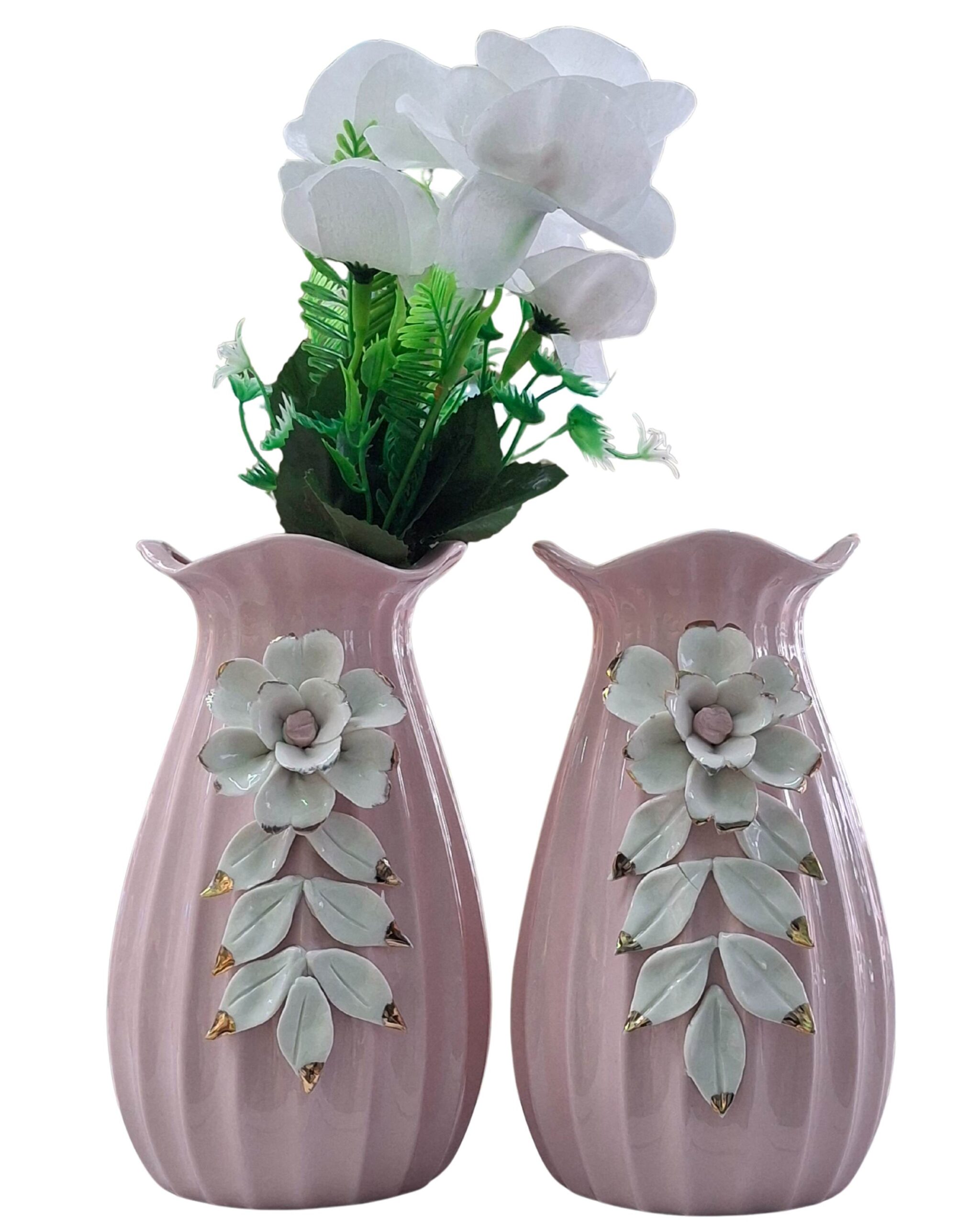 The vase bodies have a fluted texture, and their soft curves enhance the romantic and decorative appeal. Each vase features a sculpted white floral embellishment with attached cascading leaves, delicately crafted and slightly raised from the surface.