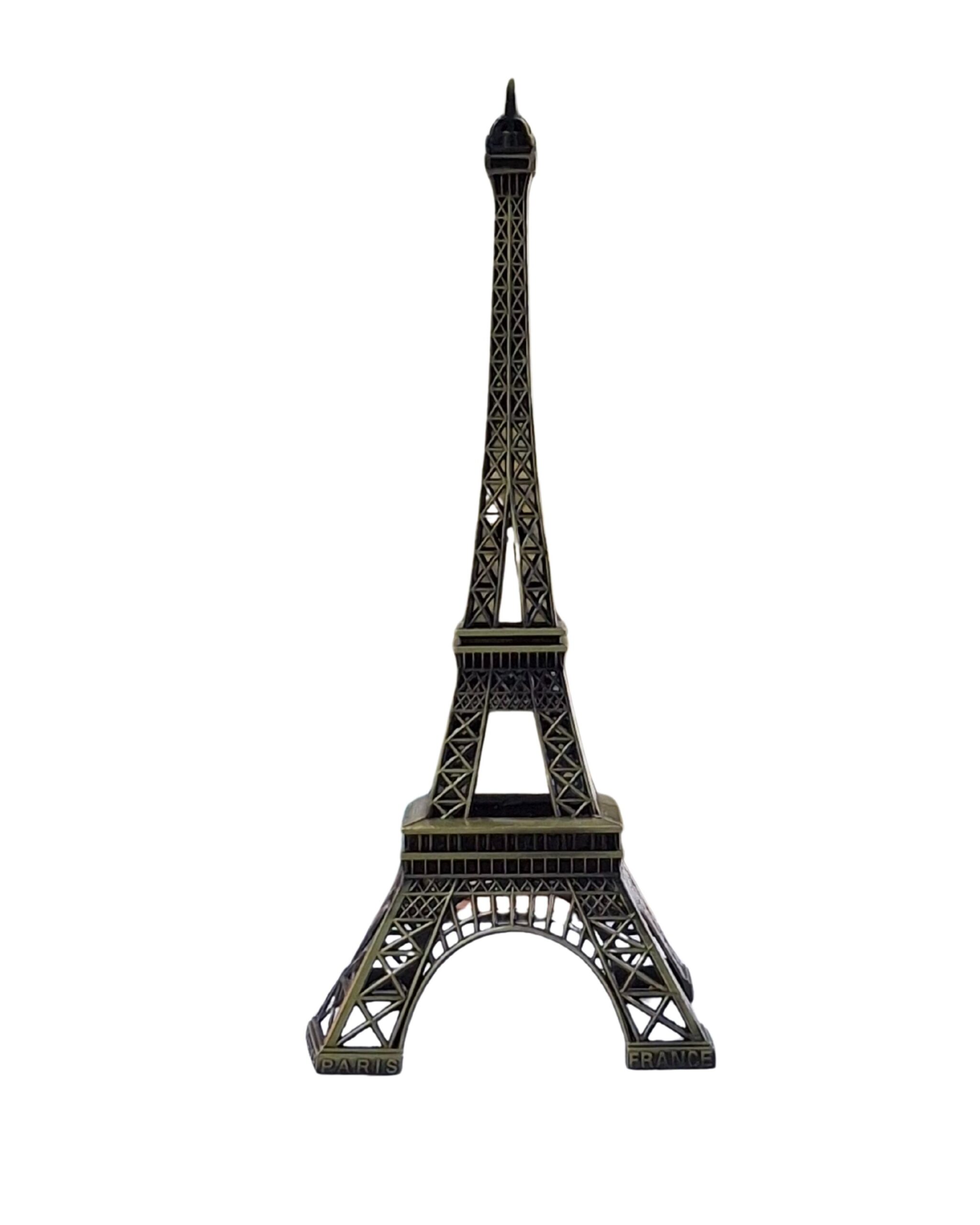 This is a small-scale decorative replica of the Eiffel Tower, crafted with detailed lattice work that closely resembles the original Paris landmark. The base features the engraved words “PARIS” and “FRANCE,” enhancing its souvenir appeal. Finished in a dark metallic tone with a slightly aged effect, it is ideal as a keepsake, desk decor, or collectible item.