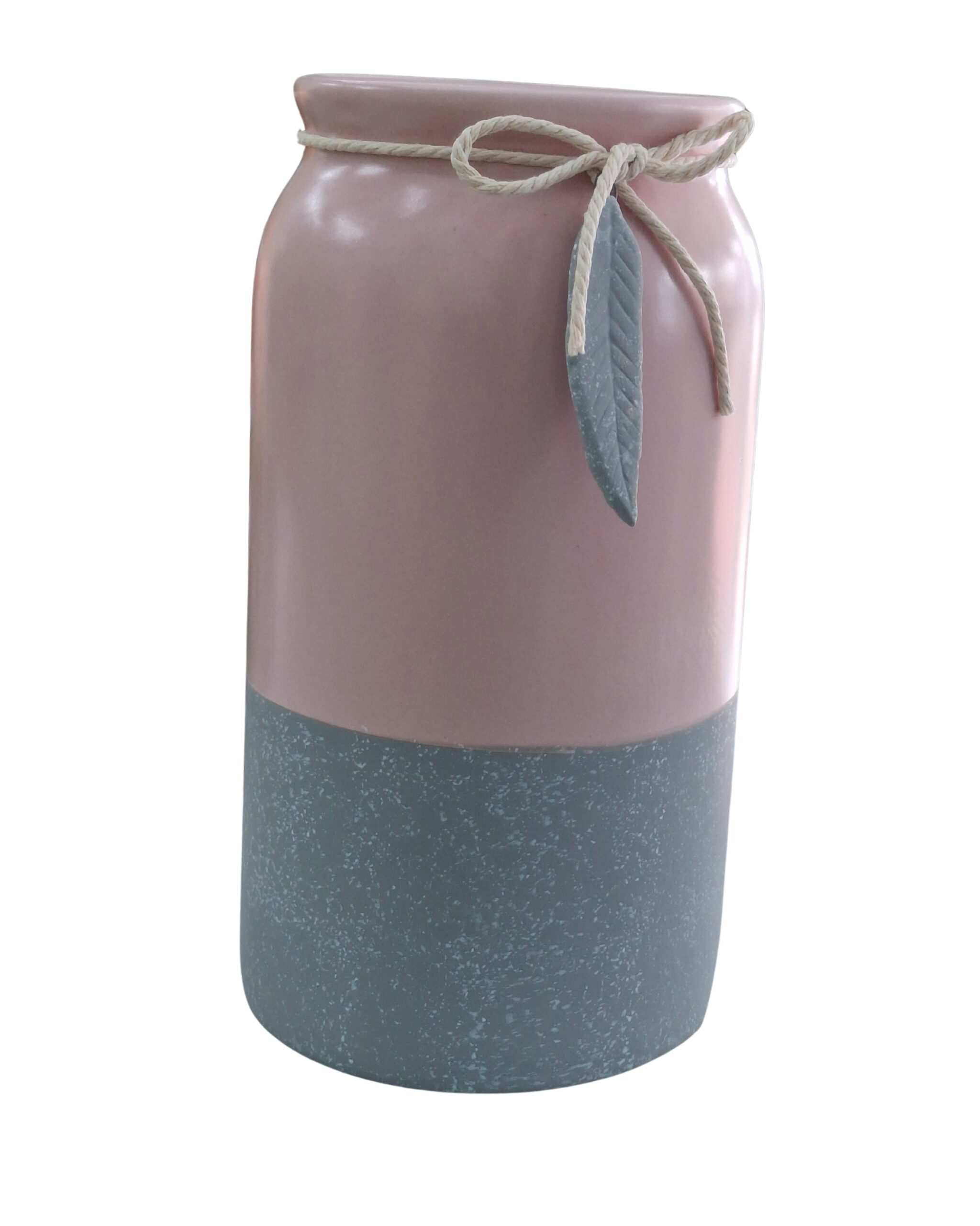 This is a two-tone cylindrical vase with a soft pink upper half and a blue-grey speckled lower half.