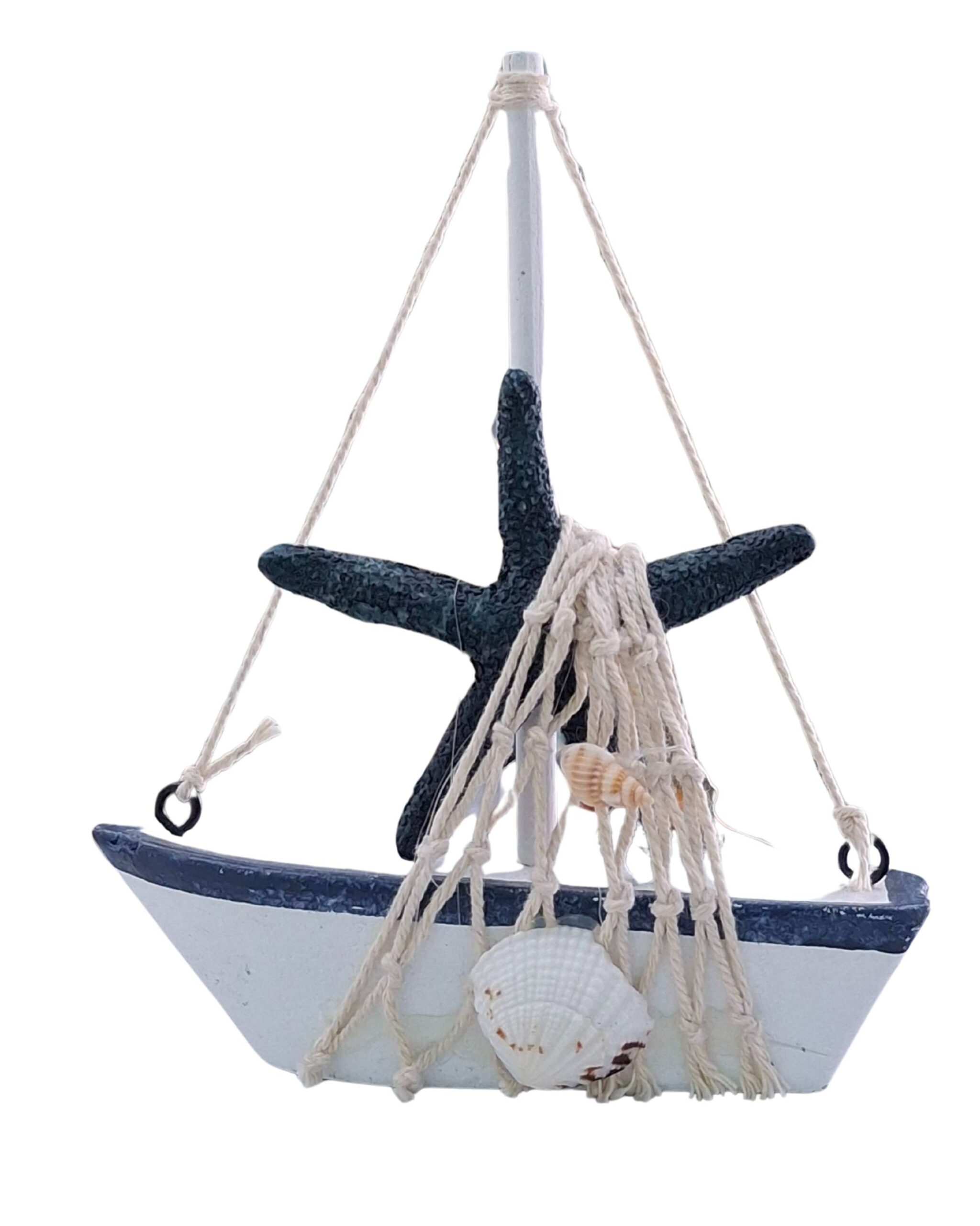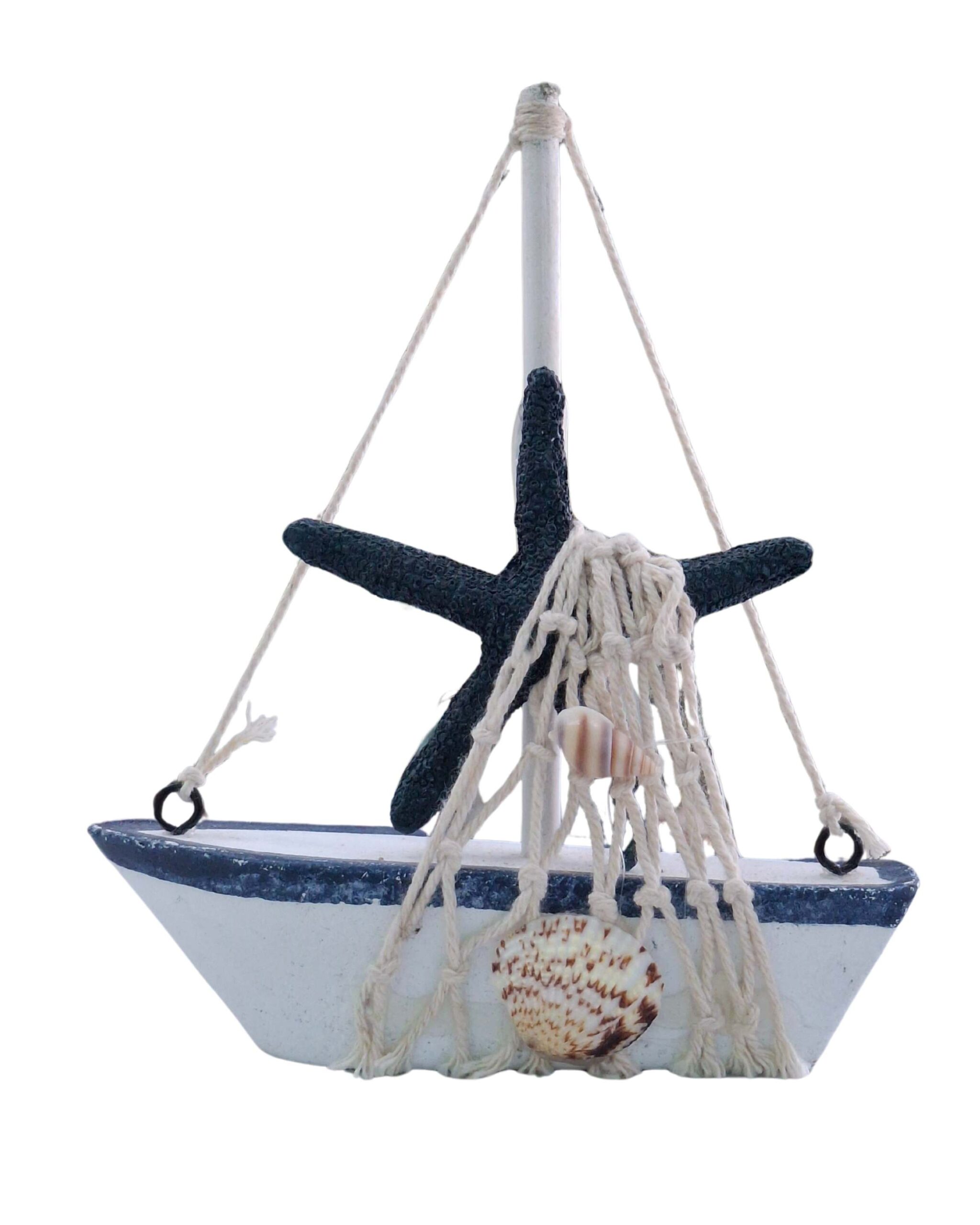 This coastal-themed decorative piece features a stylized wooden sailboat adorned with nautical elements. A textured dark blue resin starfish forms the sail, complemented by natural rope netting draped over the side. Real seashells are attached to enhance the beachy aesthetic. Designed to hang, this lightweight décor item brings a charming seaside feel, perfect for beach homes or nautical-themed rooms.