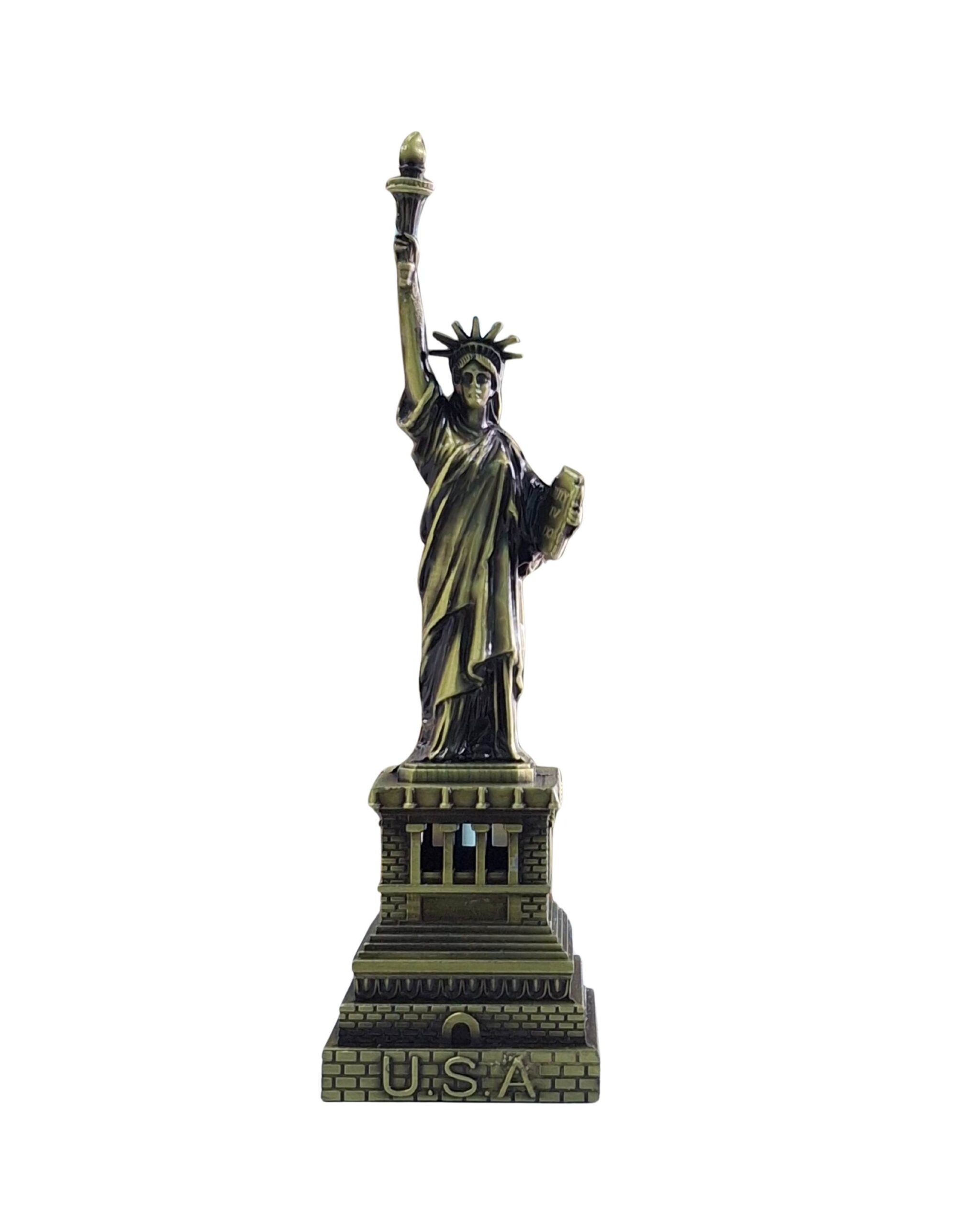 This is a miniature replica of the Statue of Liberty, featuring intricate detailing that mirrors the original monument in New York. The statue stands on a stepped rectangular base with “NEW YORK” and “U.S.A” engraved on it. The antique bronze coloring gives it a classic, vintage look, making it a popular collectible or souvenir for travelers and decor enthusiasts