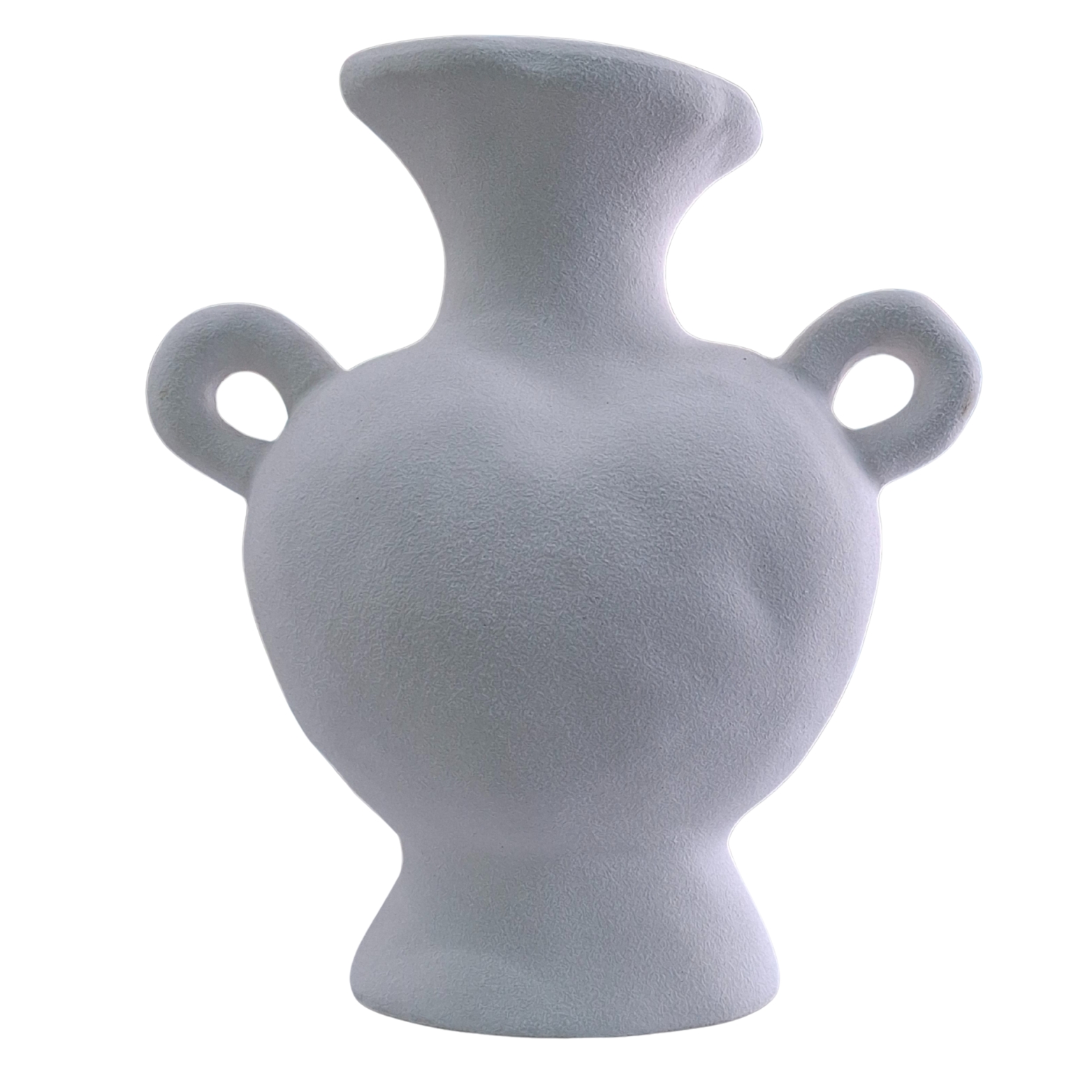 This artistic vase draws inspiration from ancient amphorae with a modern twist. It features a rounded, bulbous body, a wide flared neck, and two symmetrical loop handles on each side. Perfect as a statement piece in minimalist or eclectic interiors, it works well as a standalone decor item or for holding dried florals.